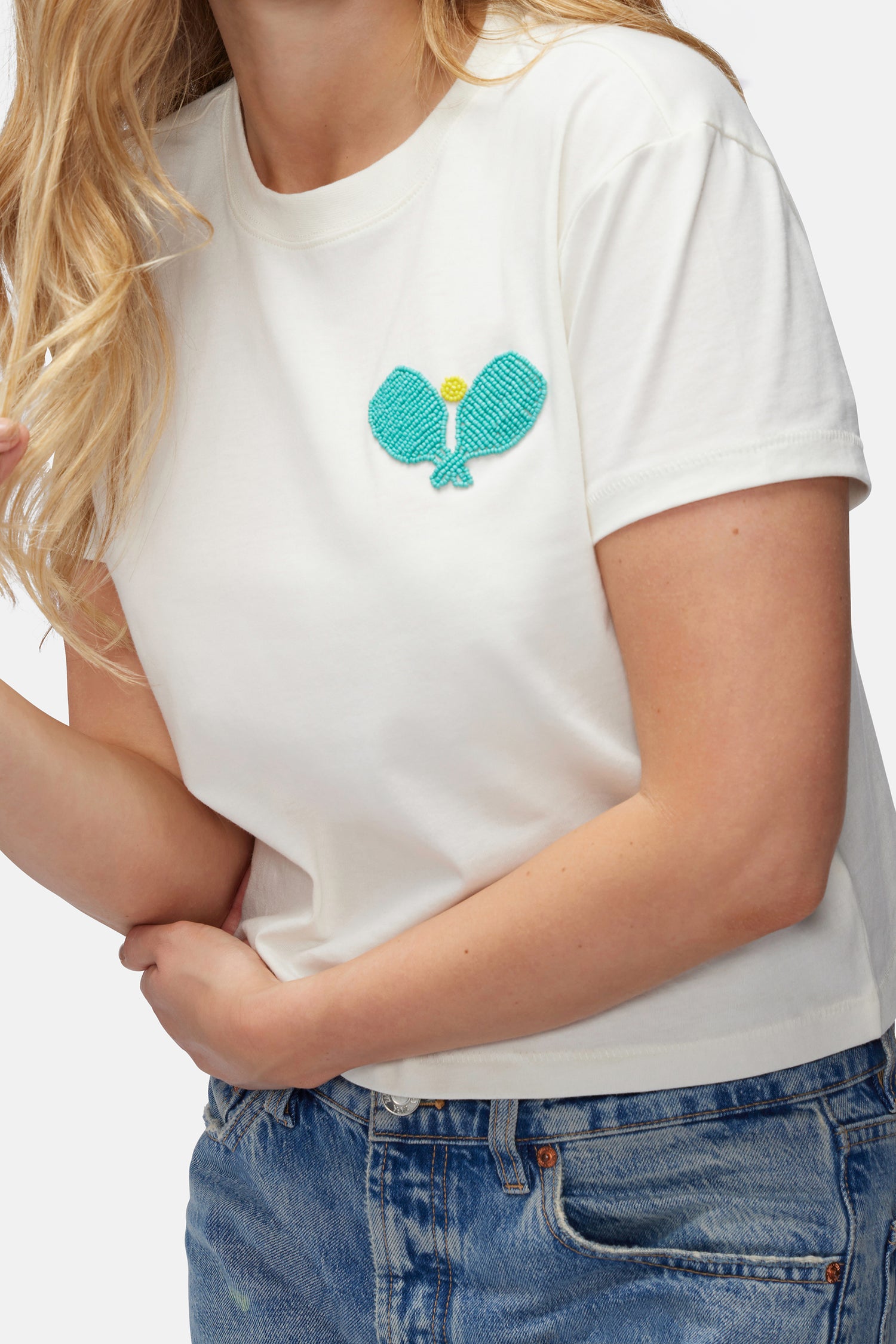 With a loose fit and a lightweight fabrication, the Jaime Crop Tee is a short, boxy crewneck in cotton knit jersey, perfect for all your sunny weekend outings. Embellished all over beads on pickleball paddles and ball detail.