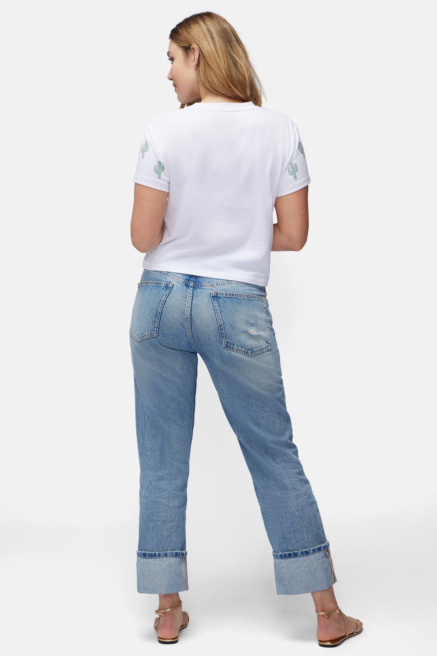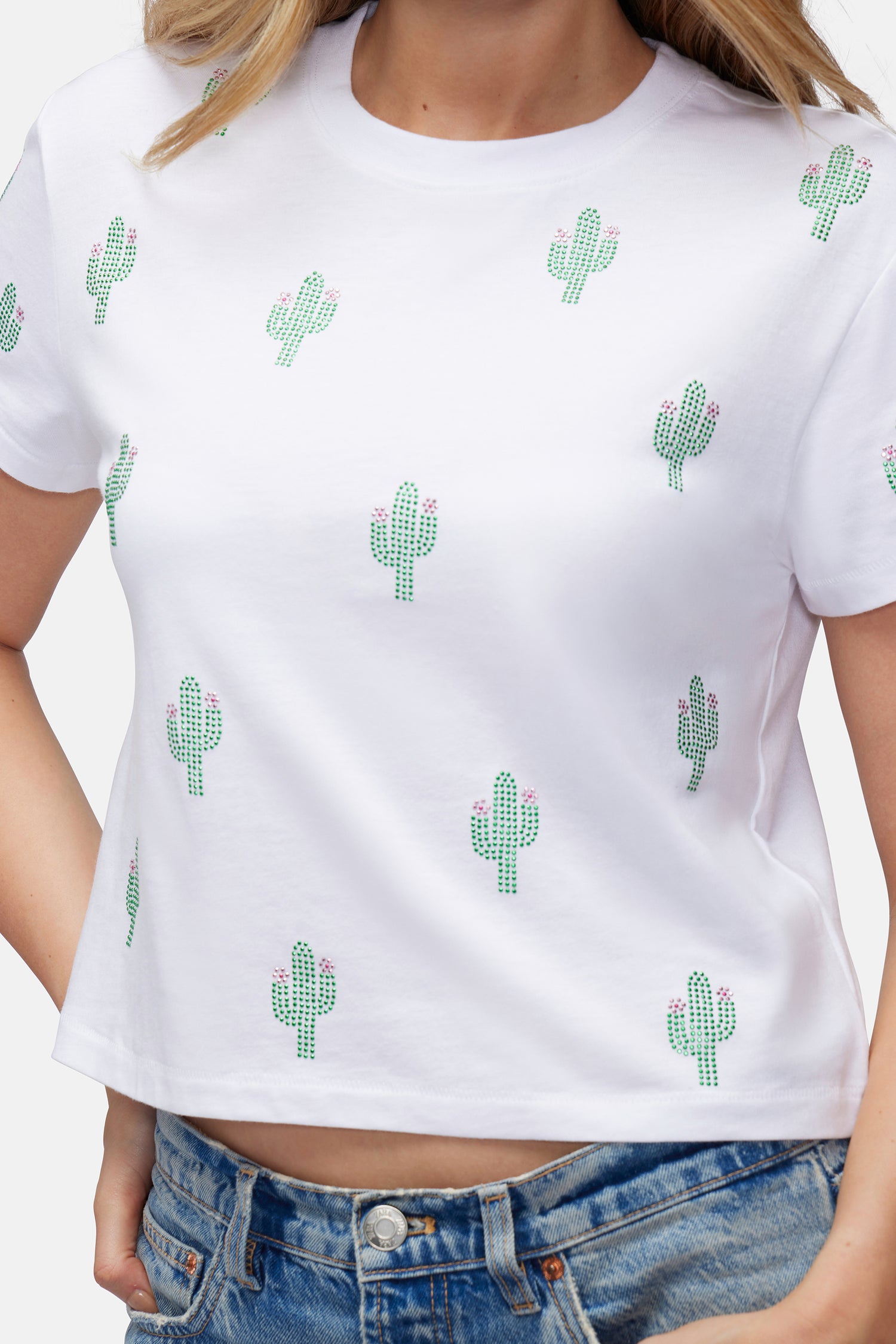 With a loose fit and a lightweight fabrication, the Jaime Crop Tee is a short, boxy crewneck in cotton knit jersey, perfect for all your sunny weekend outings. Embellished all over green rhinestones cactus detail.