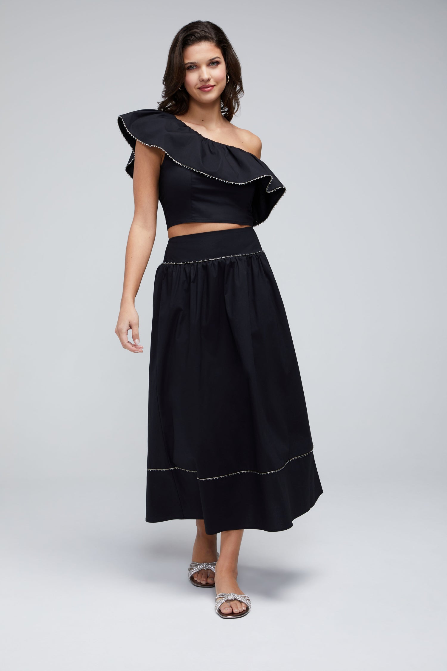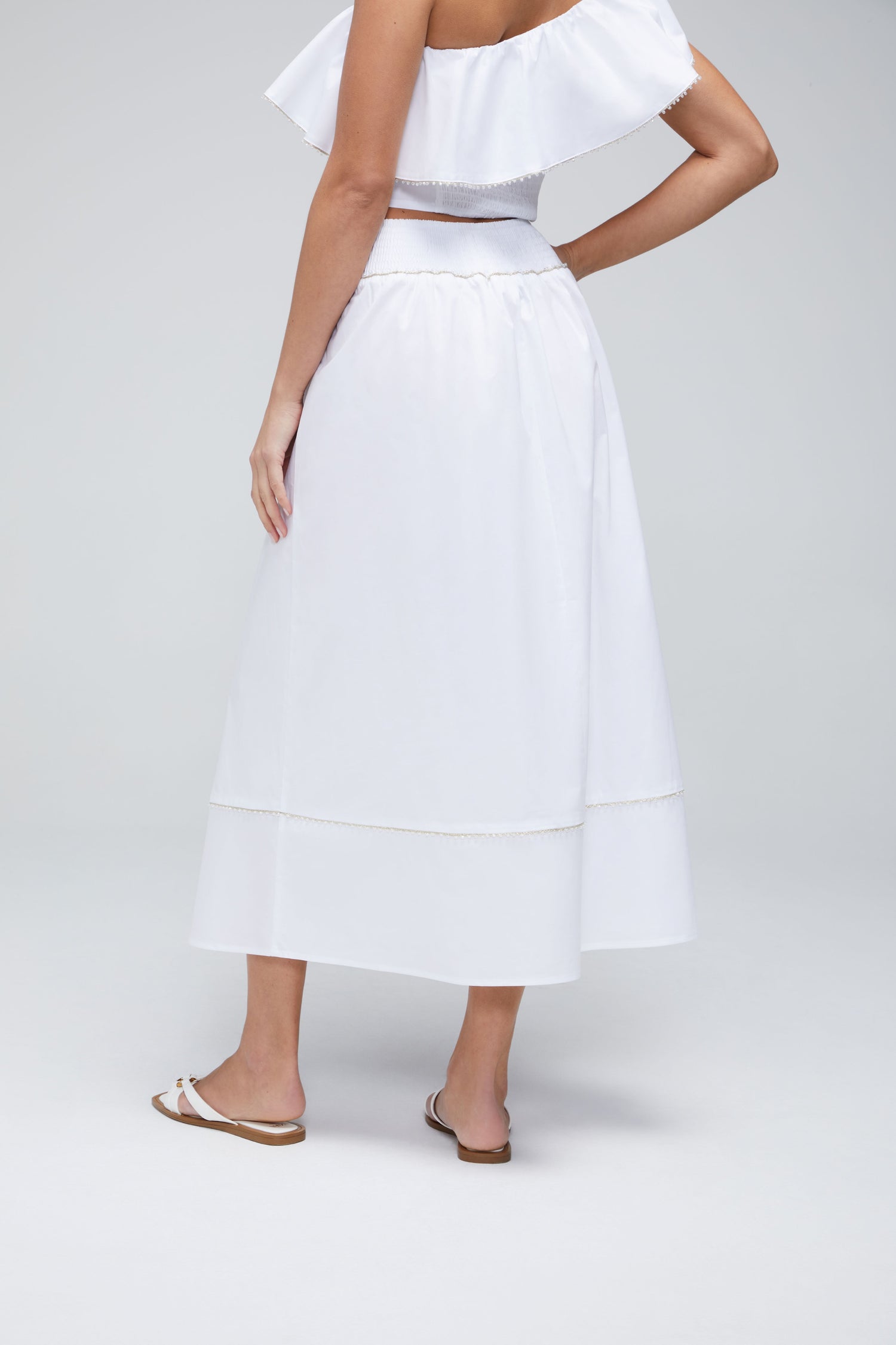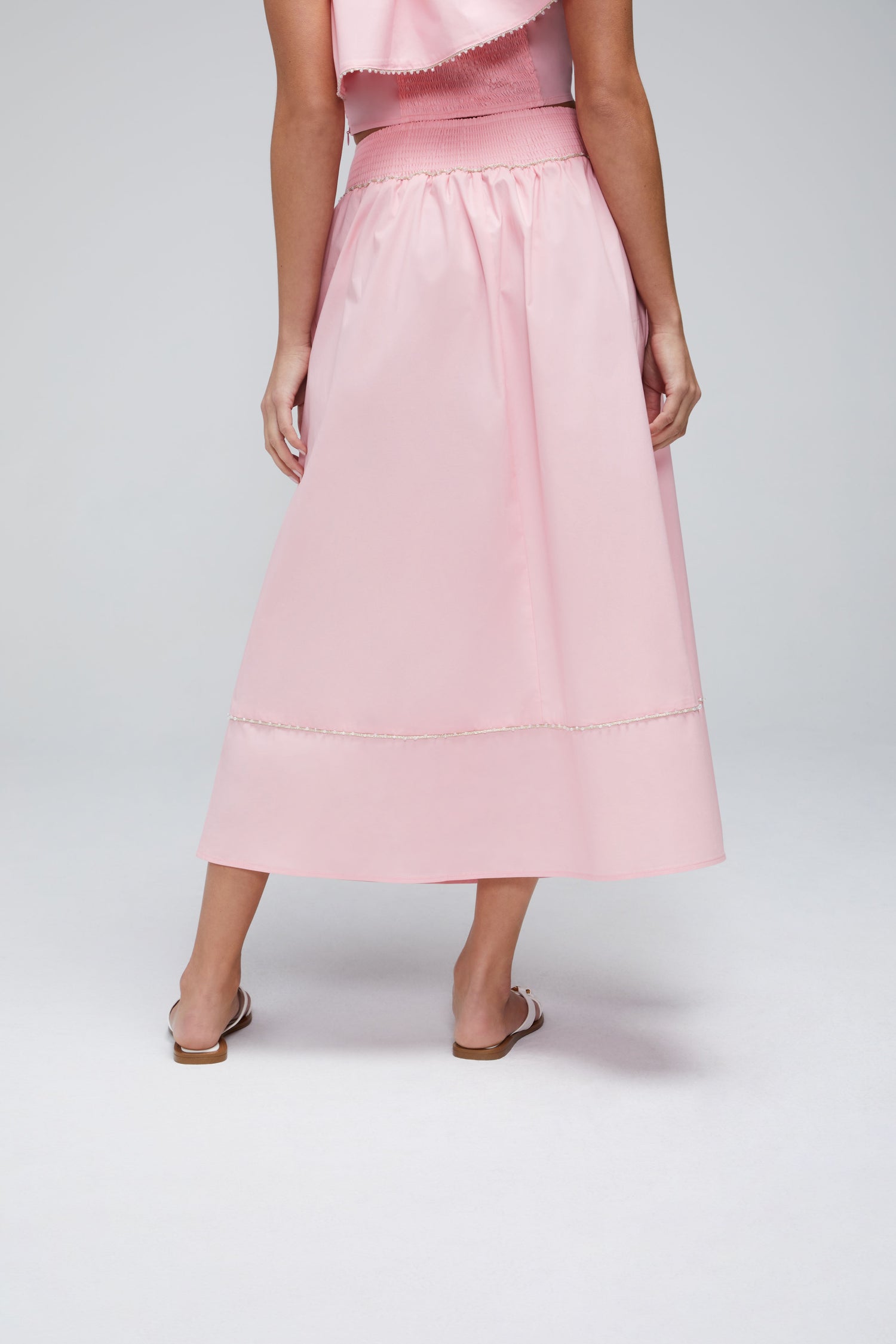Cut from cotton poplin with a touch of stretch, the Davenay Skirt is a flared maxi silhouette with a smocked back waistband and clear beaded trim accenting.