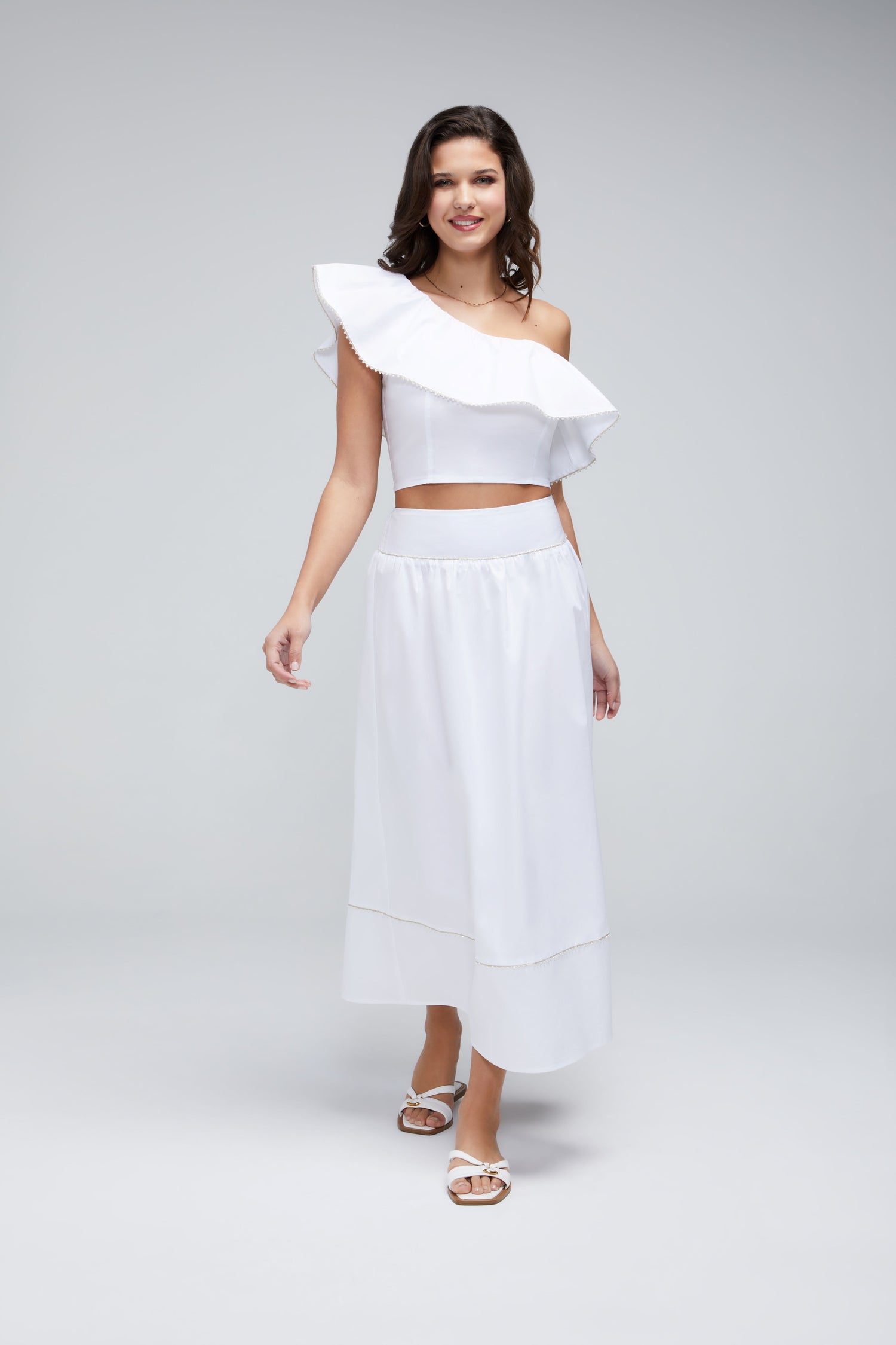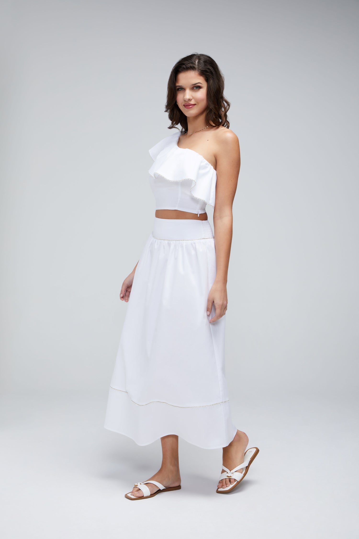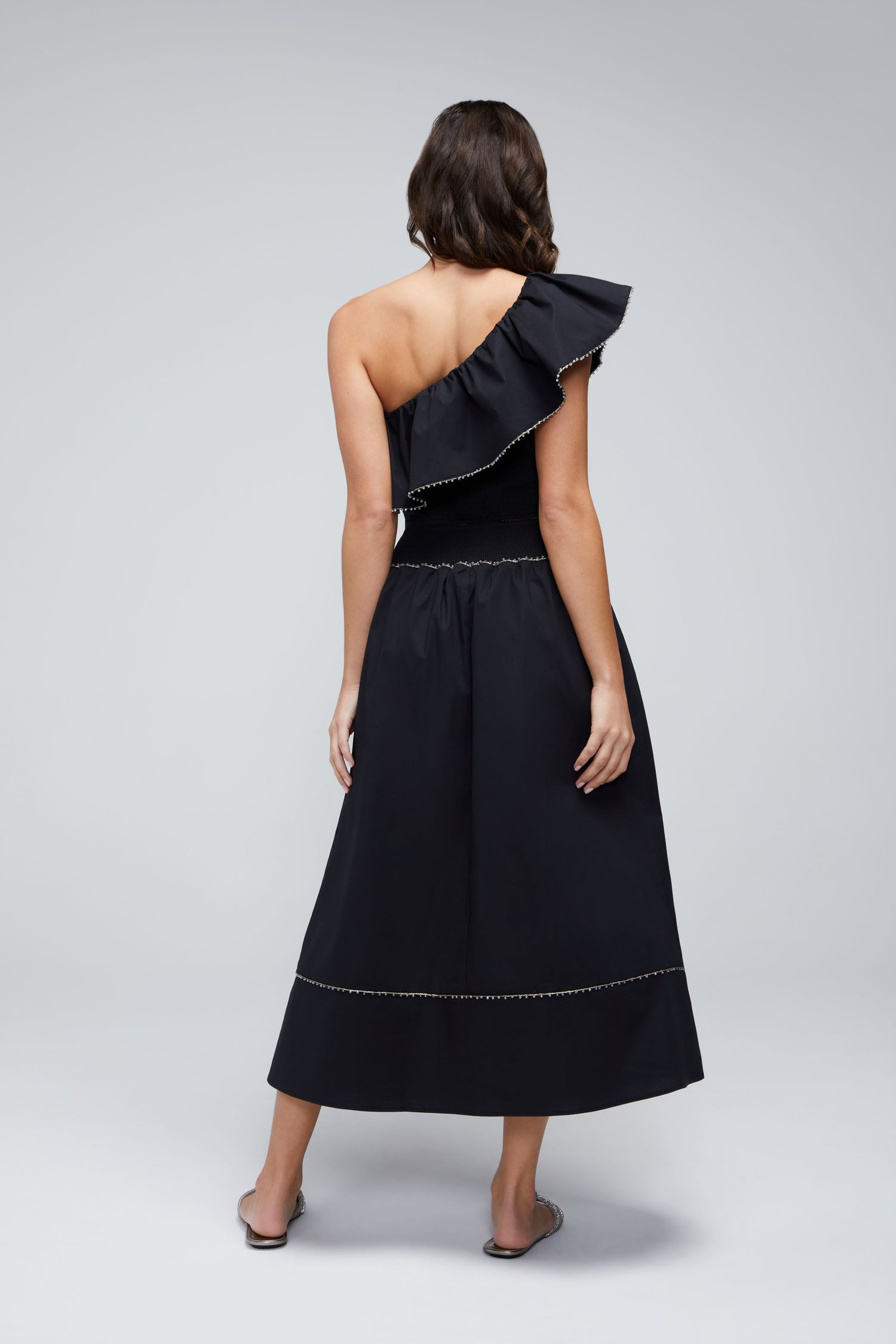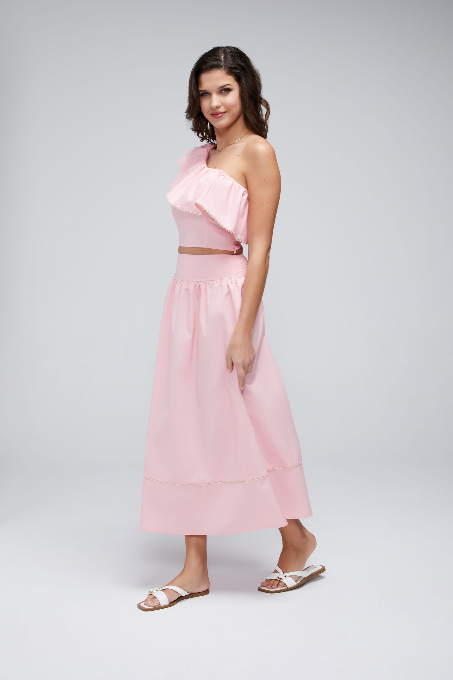 Cut from cotton poplin with a touch of stretch, the Davenay Skirt is a flared maxi silhouette with a smocked back waistband and clear beaded trim accenting.