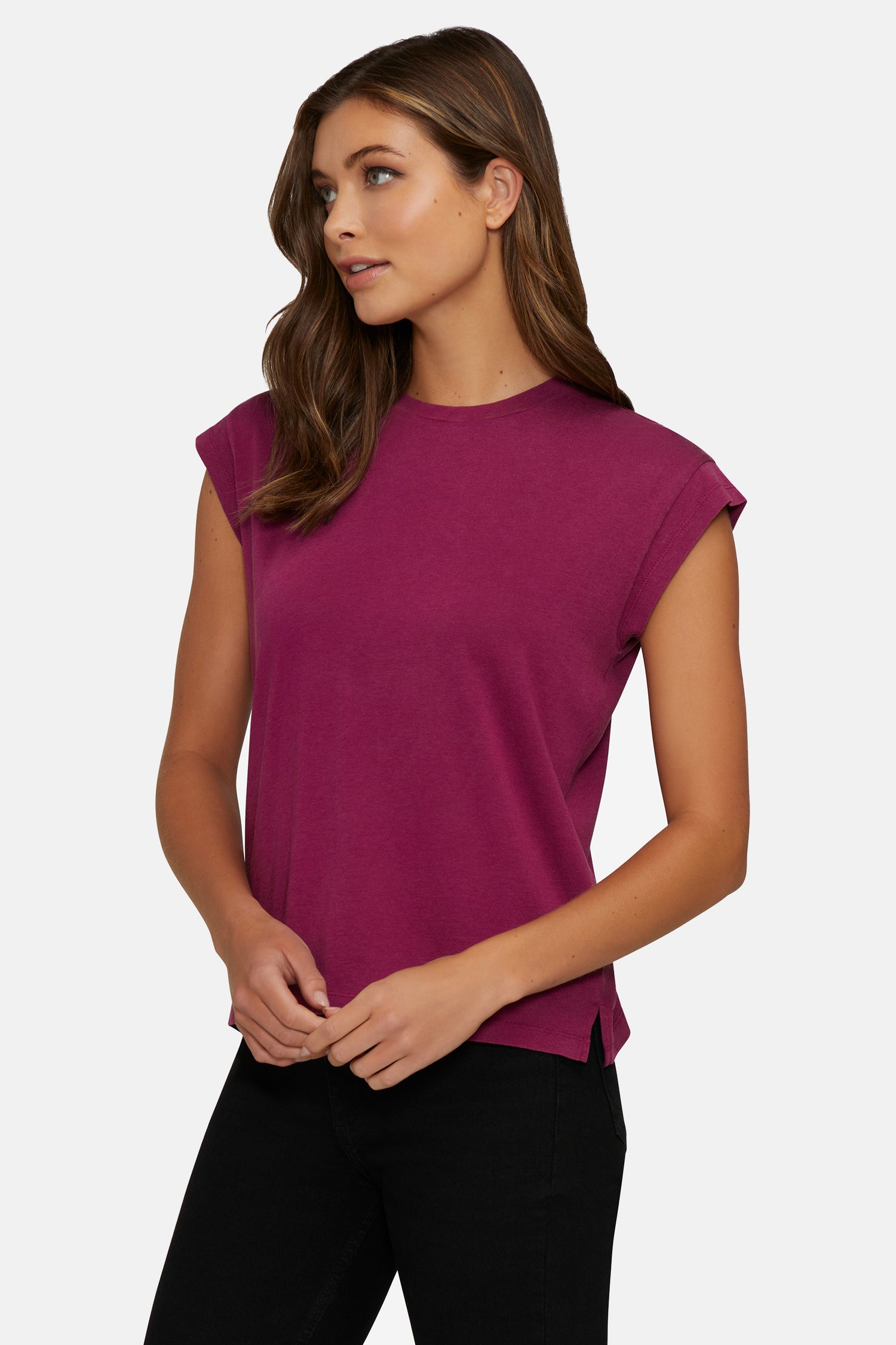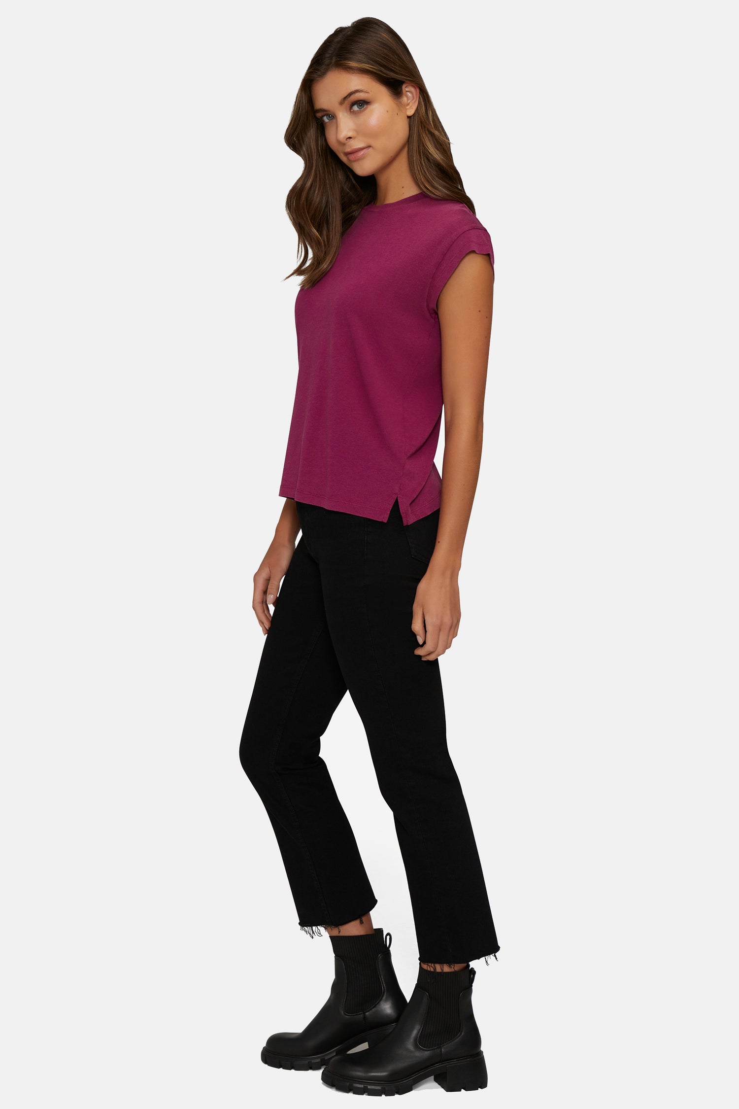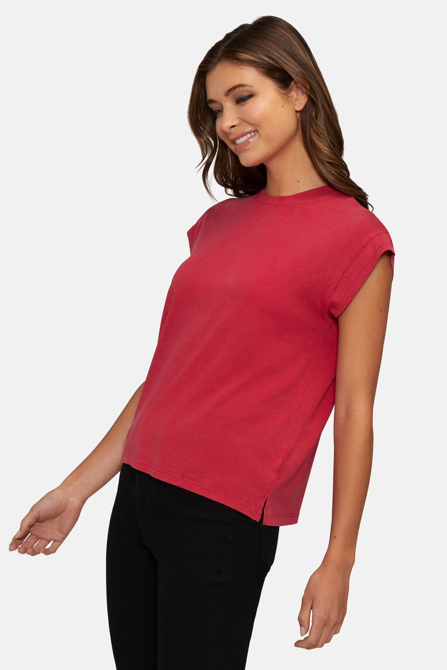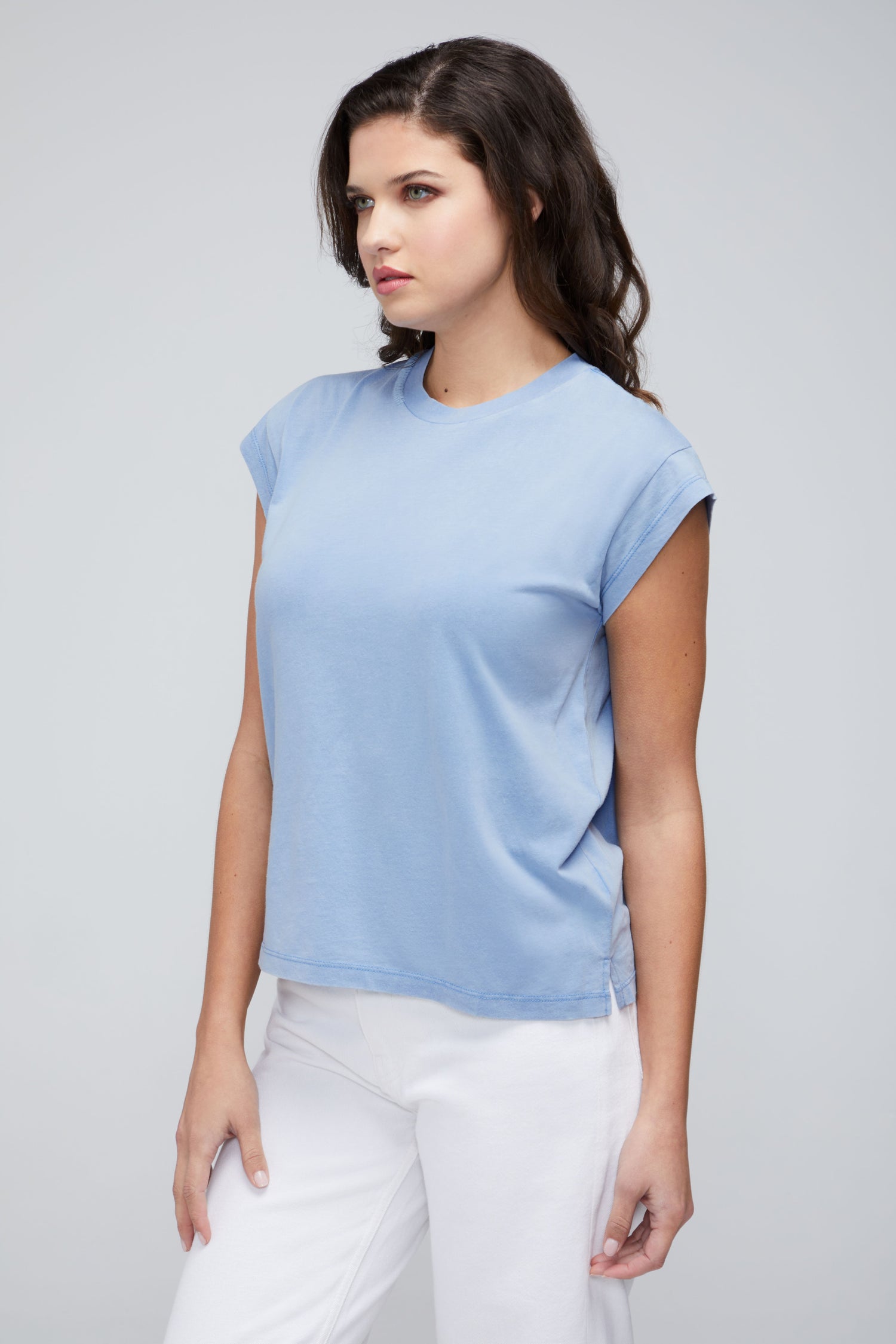 A much cuter variation of the classic gym tank, the Helena Muscle Tee is a boxy, relaxed crewneck in a breathable cotton blend, with dropped shoulders, cap sleeves, and short side slits.
