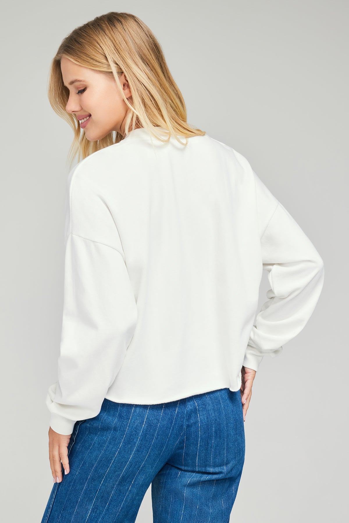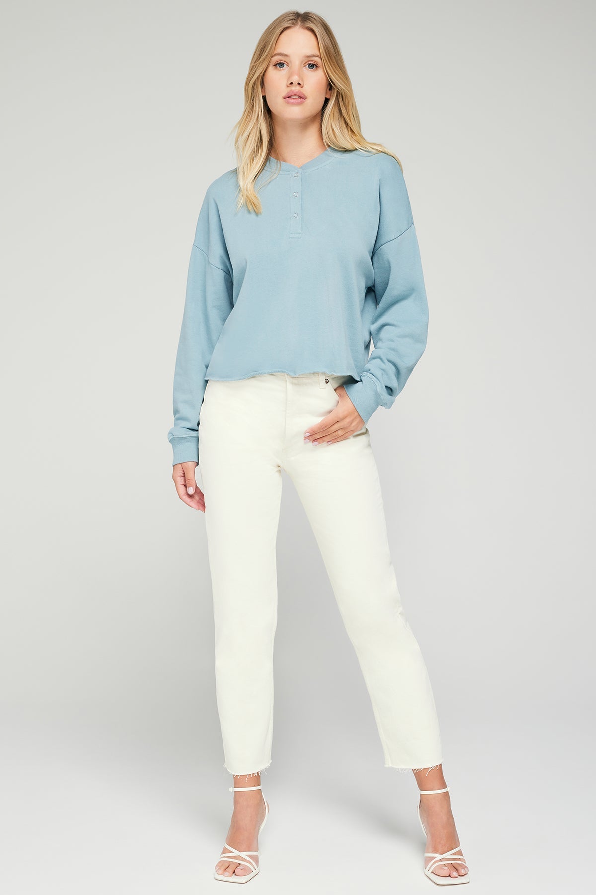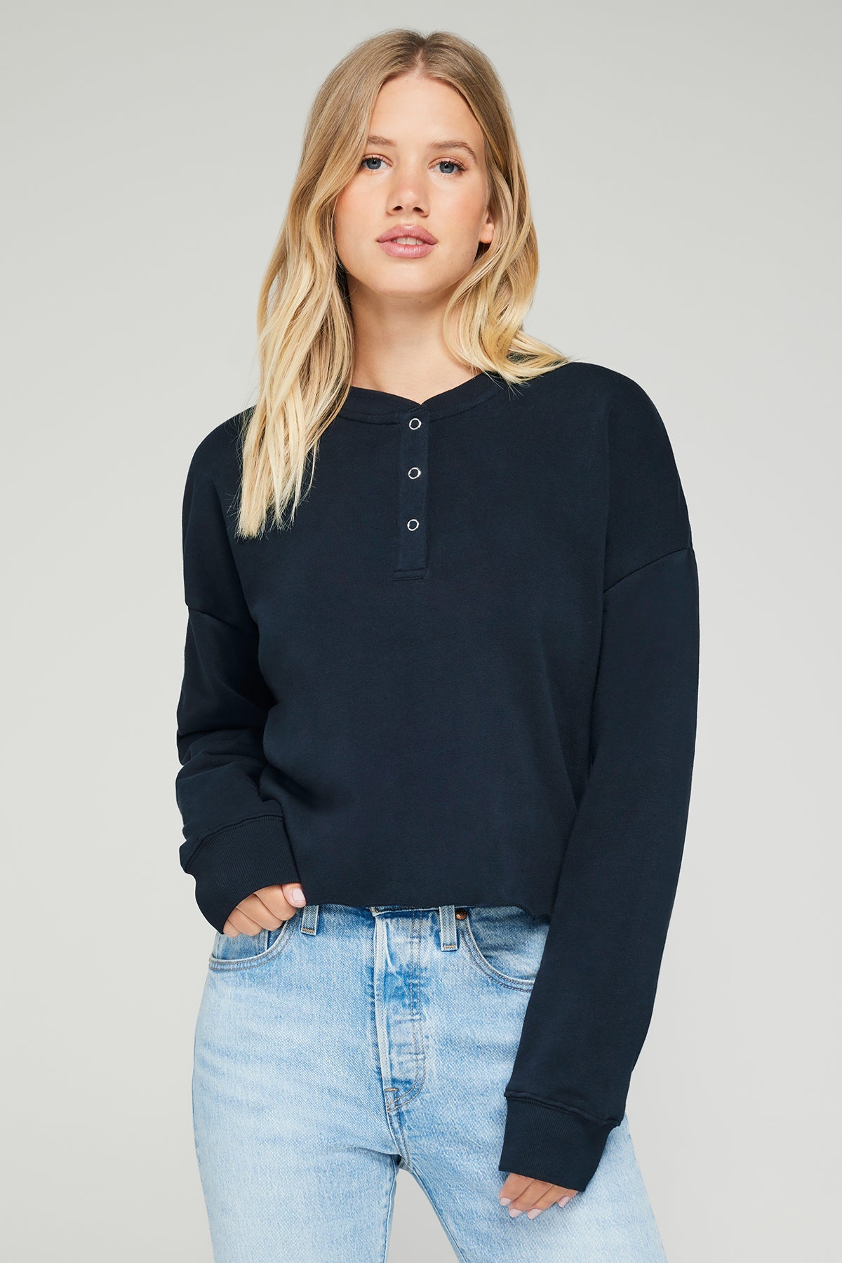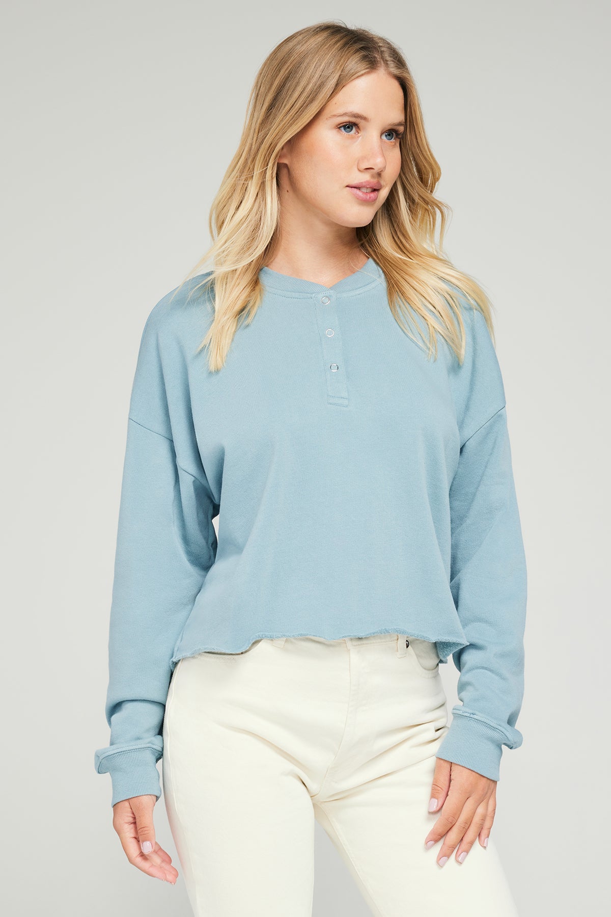 A cool update on the classic style, the loose-fit Miami Henley in cotton towel terry features extra long sleeves, dropped shoulders, a raw-cut hem, and a rib knit collar with snap buttons.