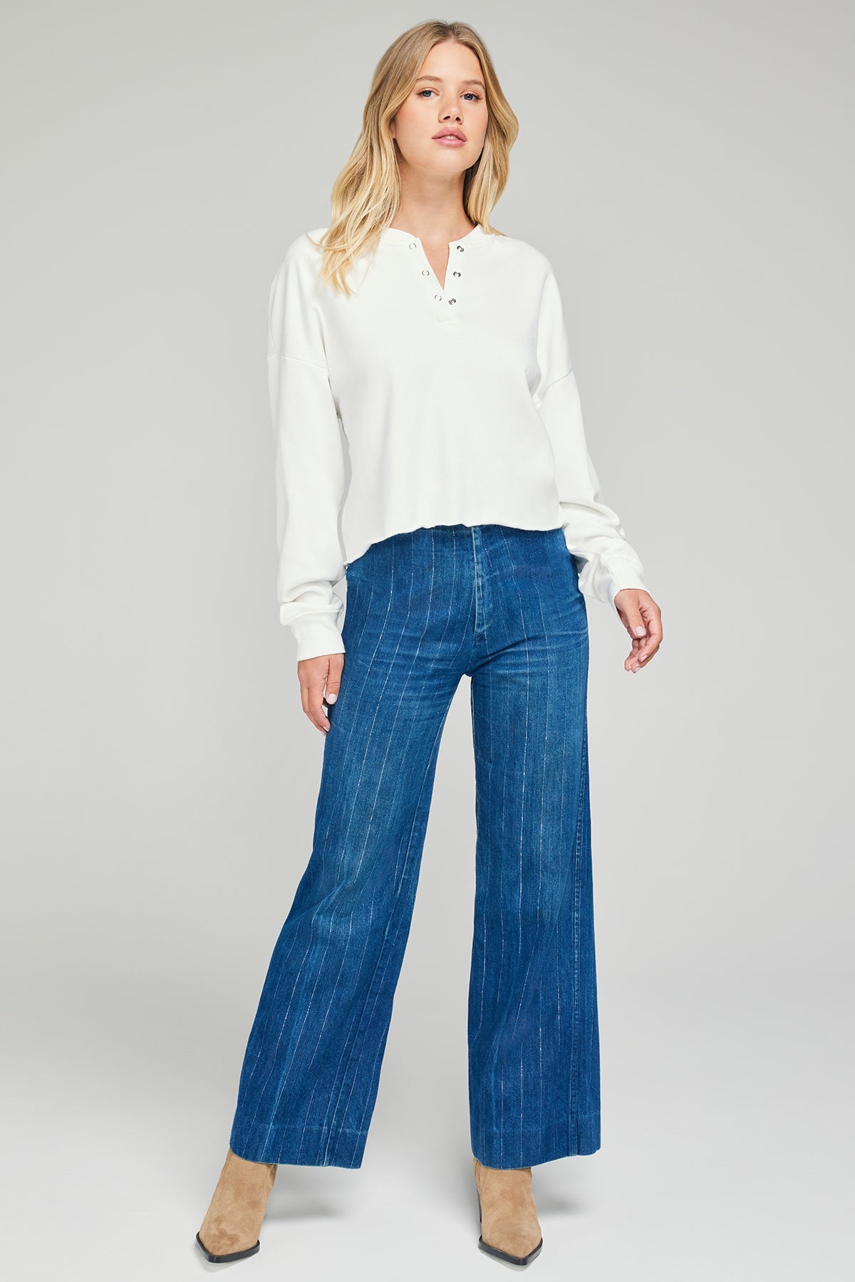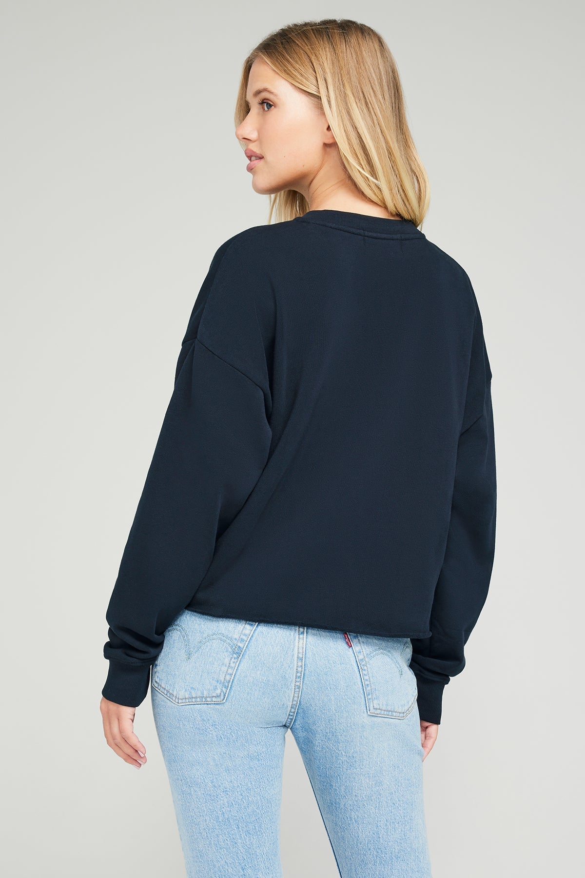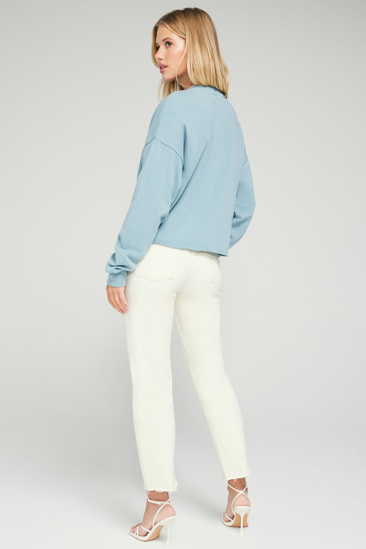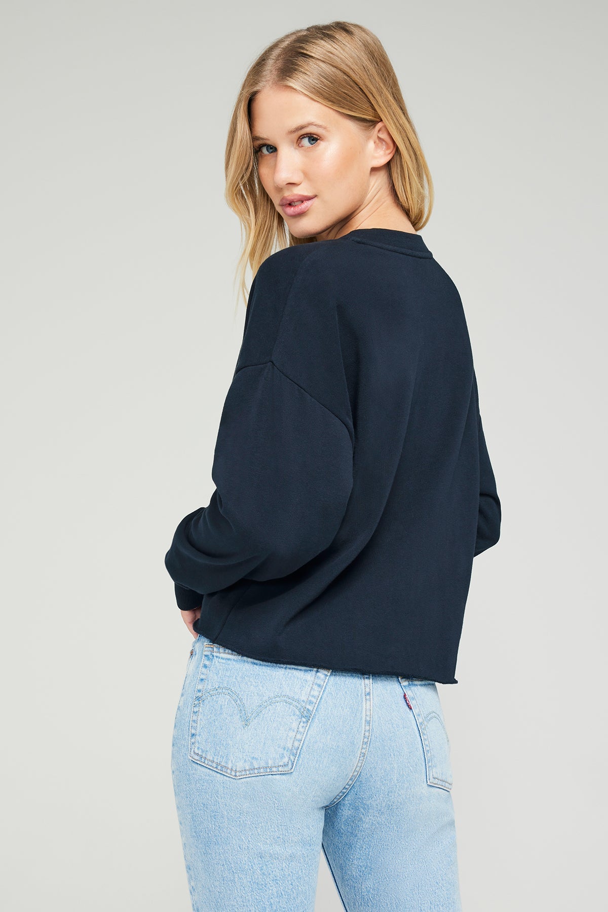A cool update on the classic style, the loose-fit Miami Henley in cotton towel terry features extra long sleeves, dropped shoulders, a raw-cut hem, and a rib knit collar with snap buttons.