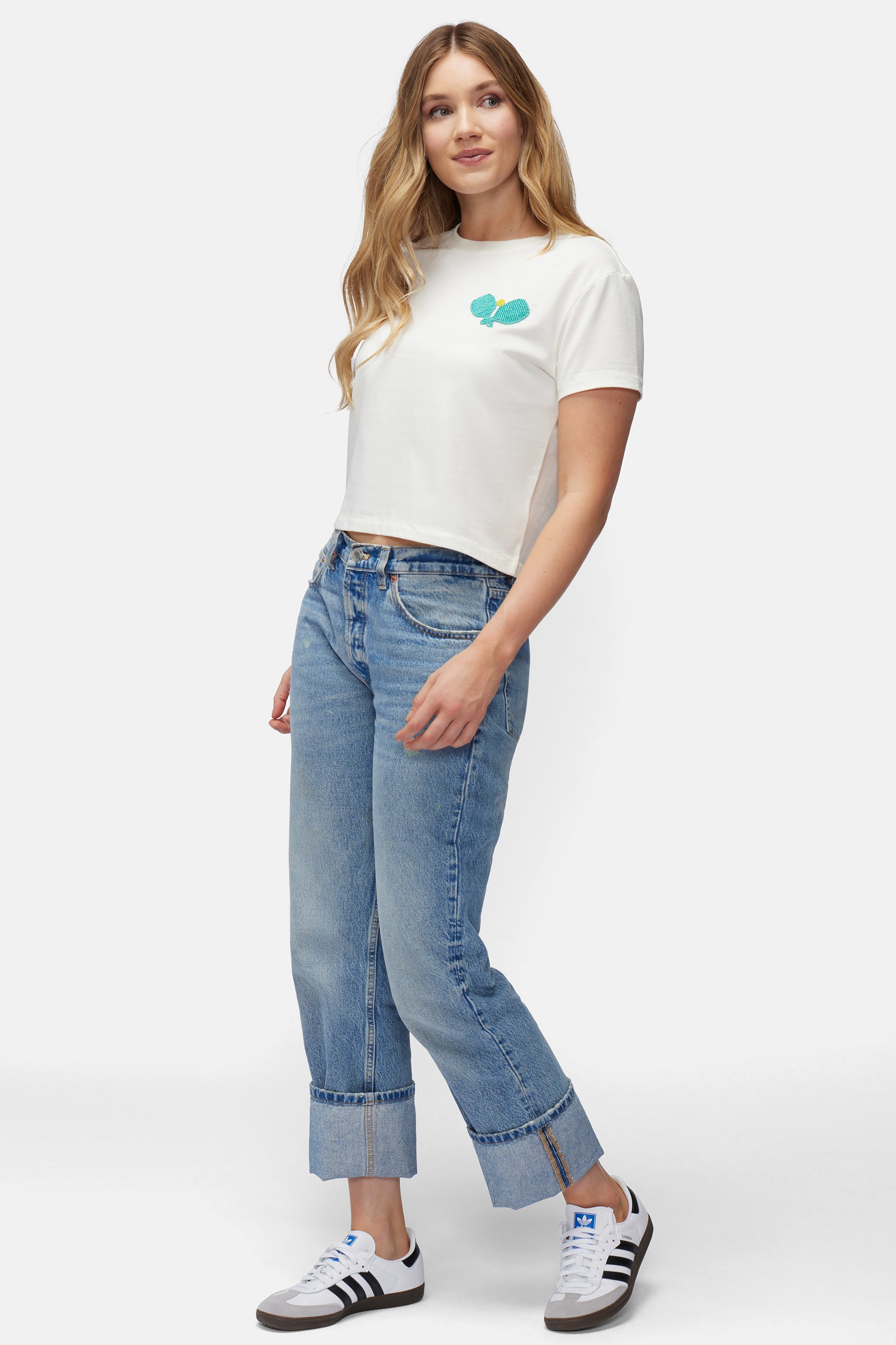 With a loose fit and a lightweight fabrication, the Jaime Crop Tee is a short, boxy crewneck in cotton knit jersey, perfect for all your sunny weekend outings. Embellished all over beads on pickleball paddles and ball detail.
