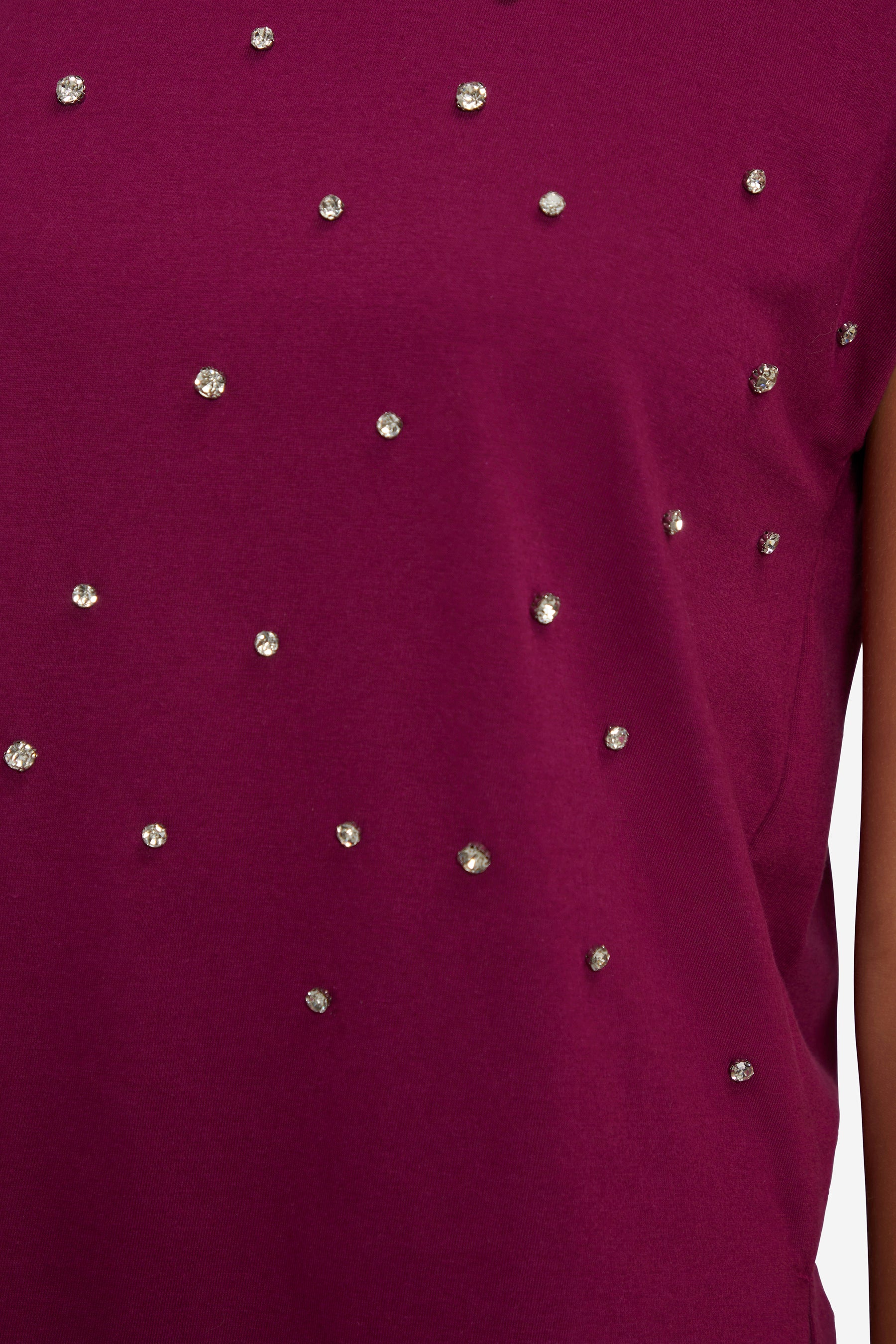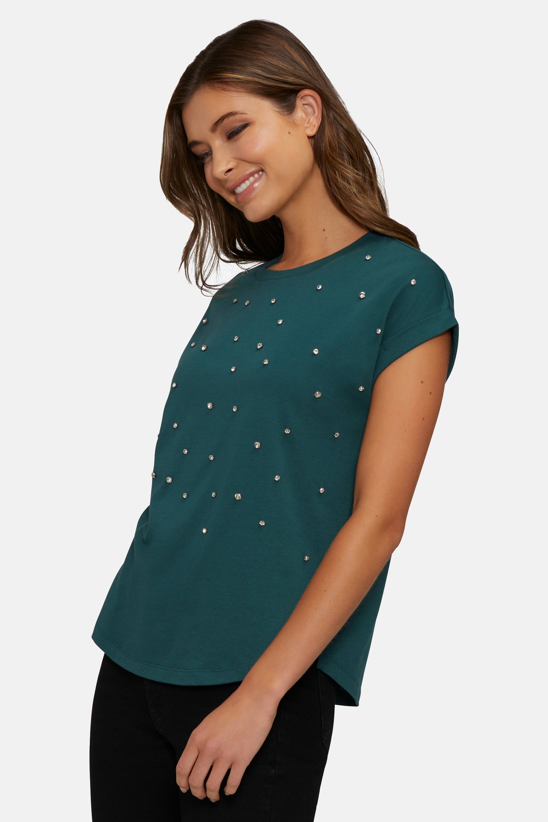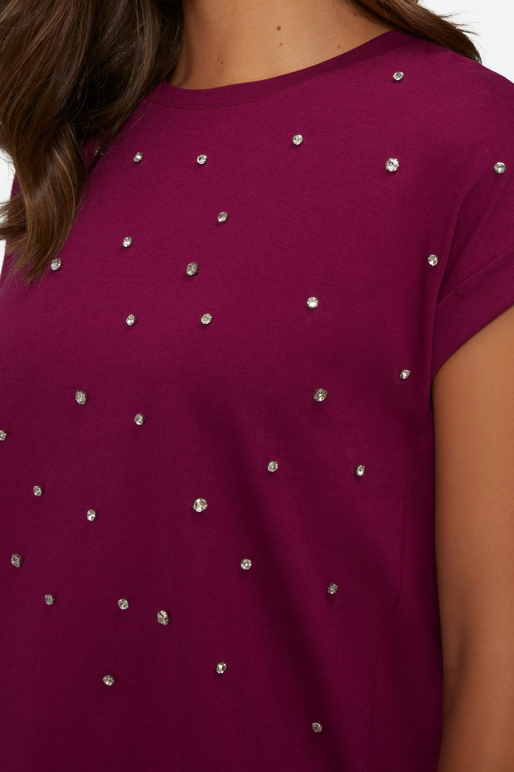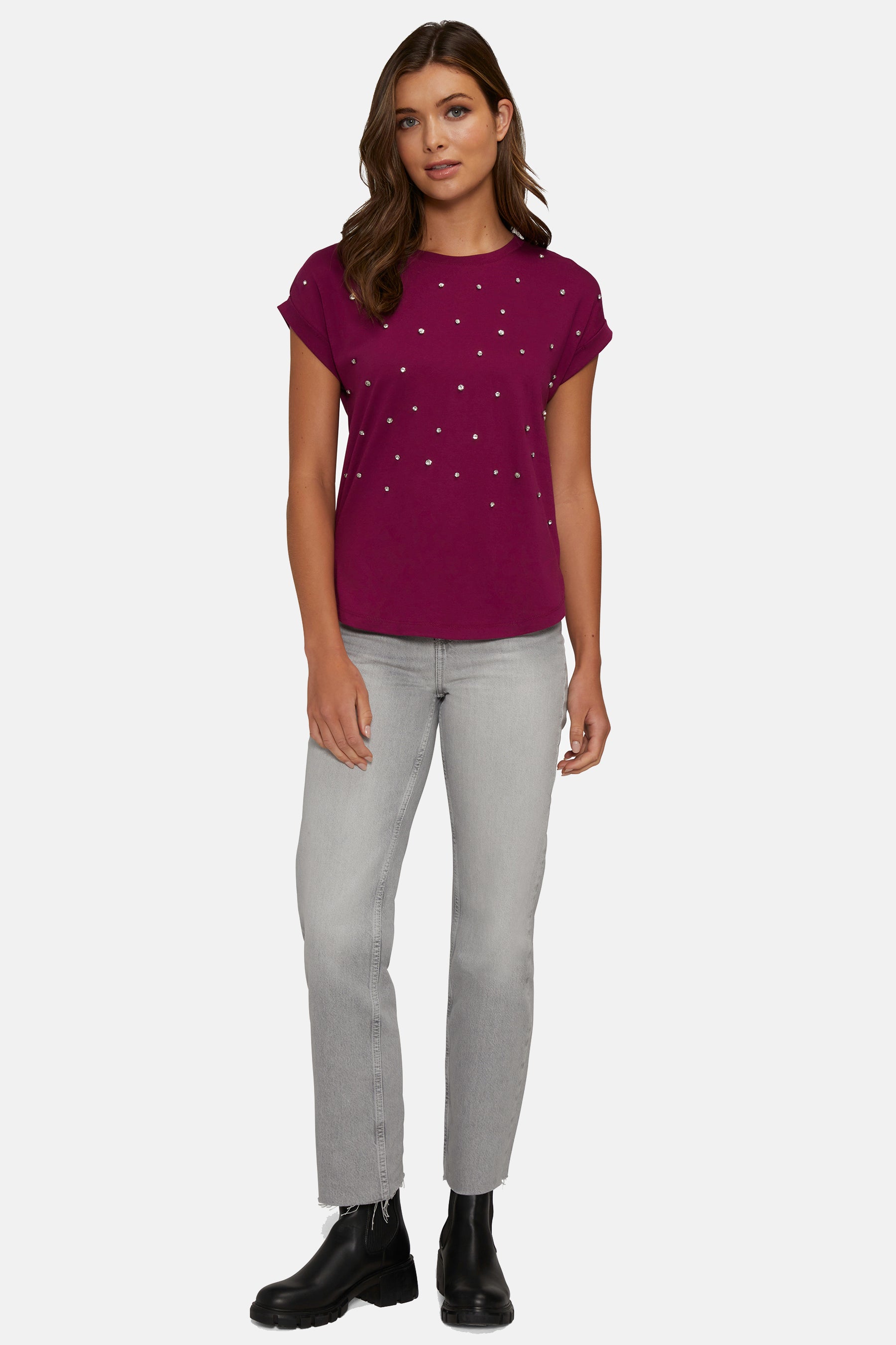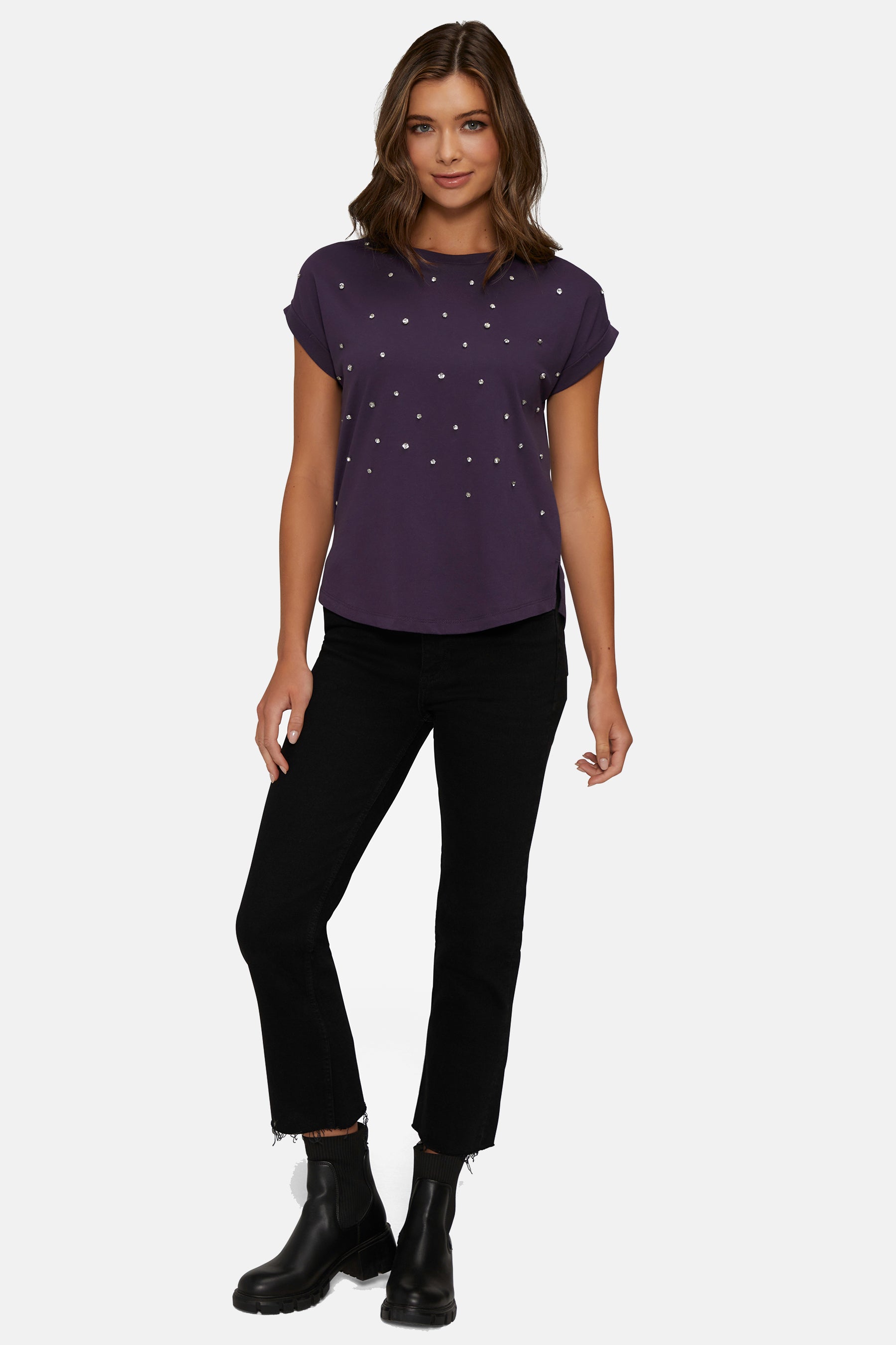 A relaxed silhouette in cotton-blend jersey, the Rhinestone Muscle Tee features rolled cap sleeves, a curved hem with side slits, and a scattering of faux jewels for a bit of sparkle.